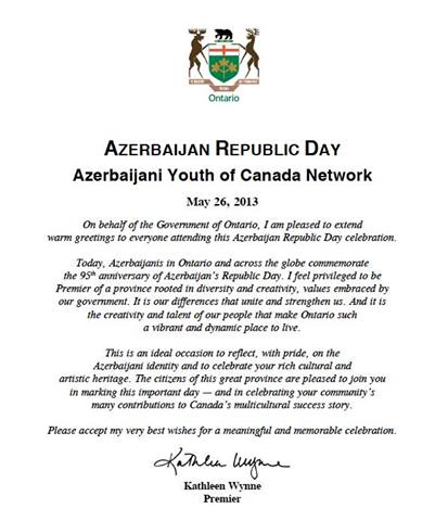 Premier of Ontario Hon. Kathleen Wynne’s Message for Azerbaijan Republic Day Celebration
