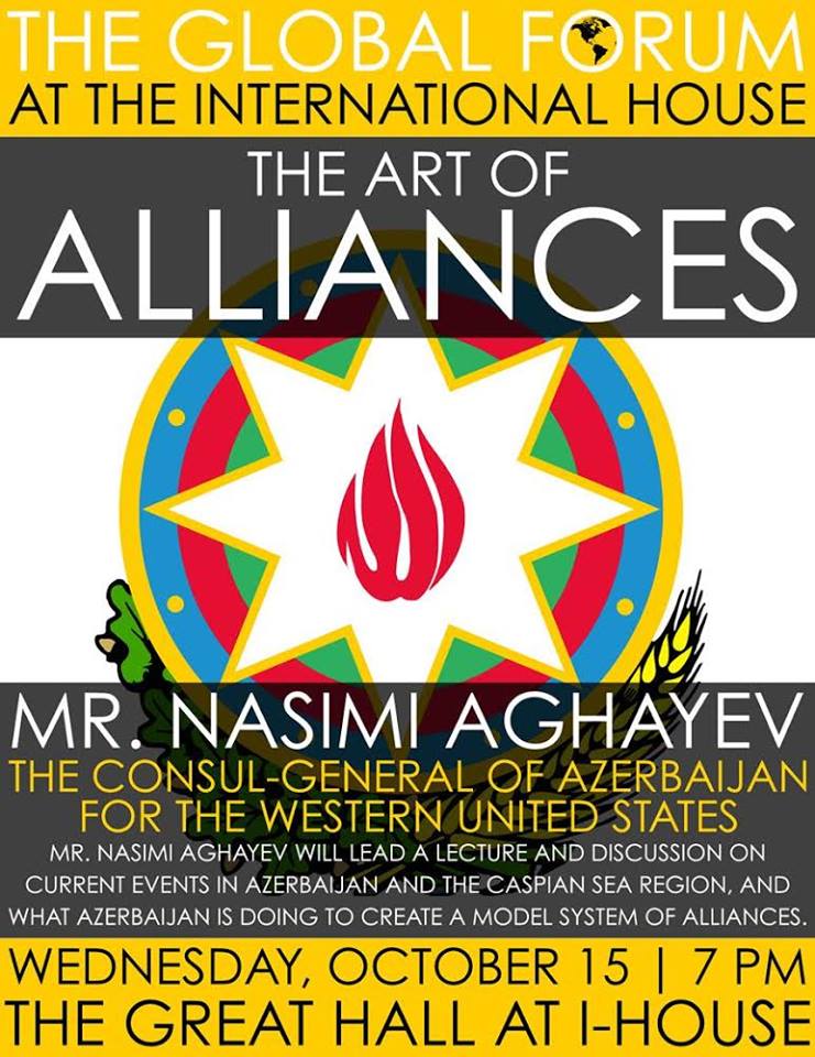 Mr. Nasimi Aghayev will lead a lecture and discussion on current events in Azerbaijan and the Caspian Sea Region, and what Azerbaijan is doing to create a mode system of alliances. Wednesday, October 15 at 7:00pm. University of California, San Diego. The event is open to public.