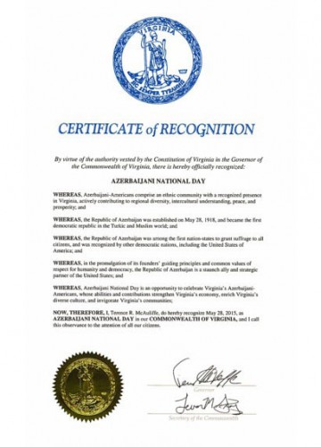State of Virginia recognizes May 28 as Azerbaijani National Day.